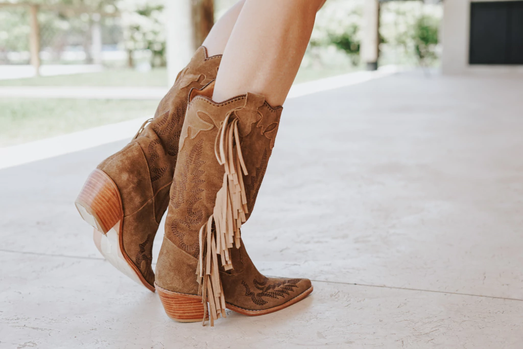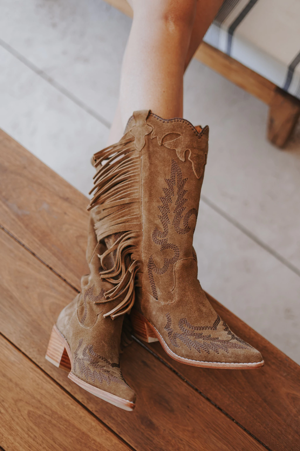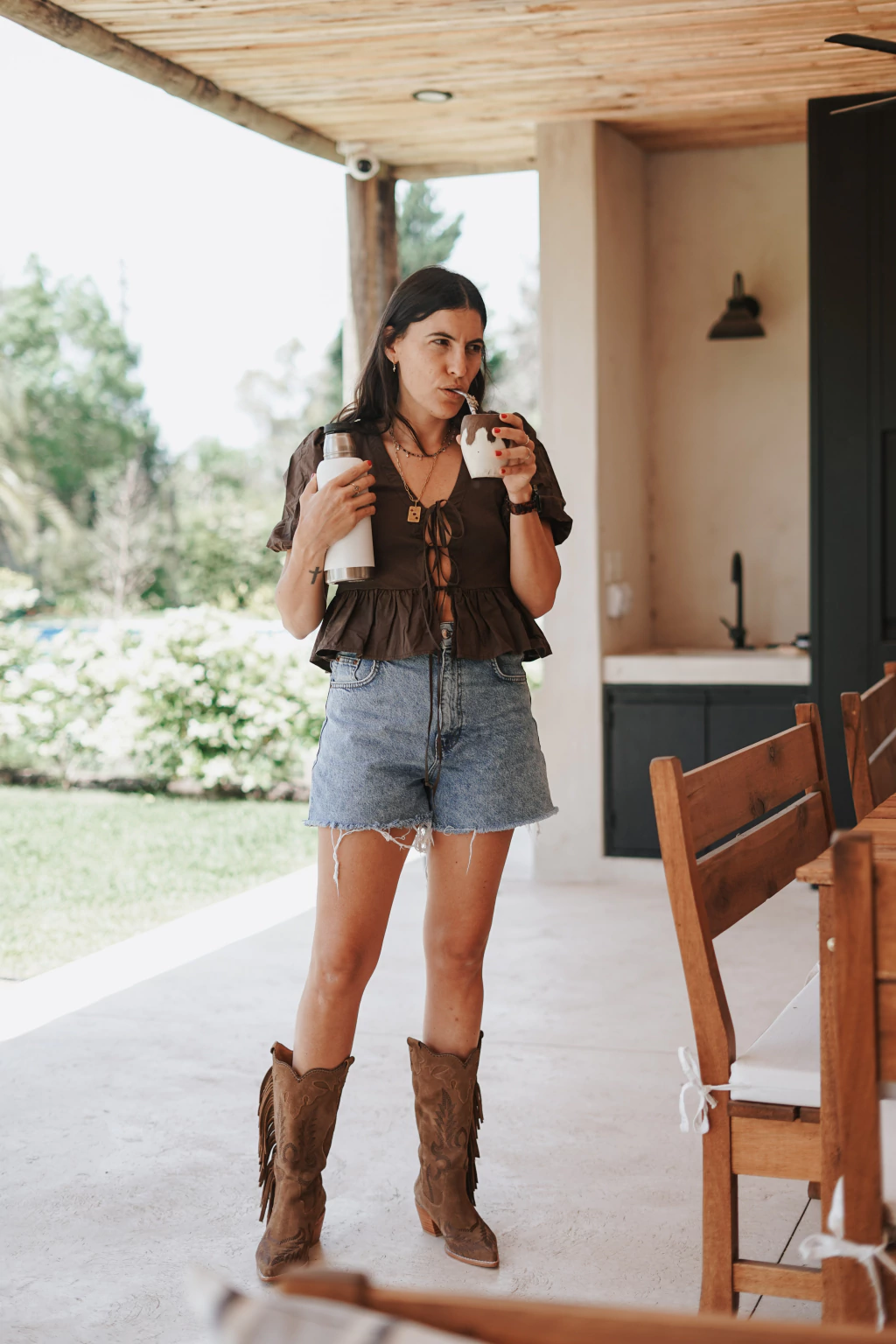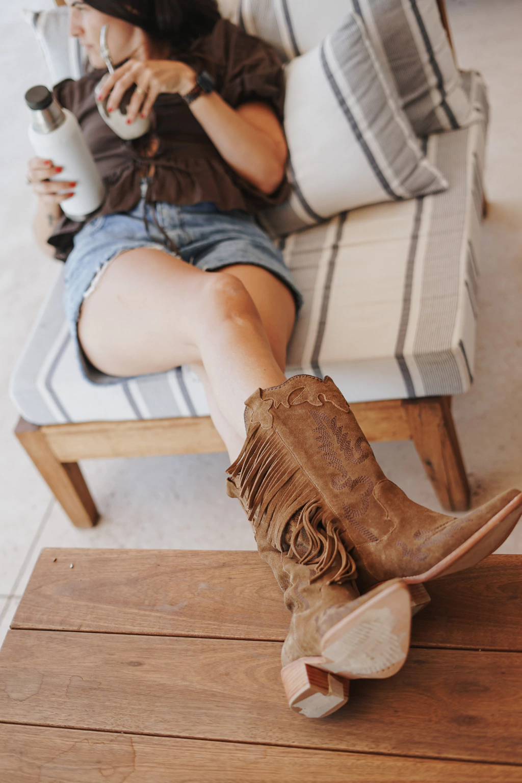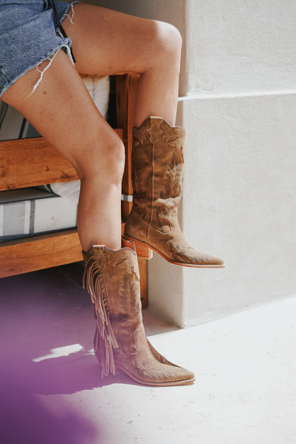 100% cuero gamuzado. Con flecos y bordados en tono chocolate.